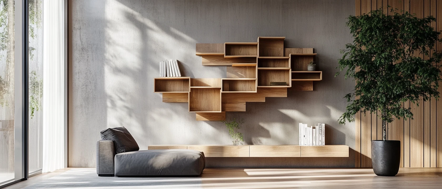 Обрезки досок разной длины можно превратить в оригинальную полку-лесенку. Расположите доски по возрастанию и закрепите их на двух вертикальных планках. Такая полка идеально подойдет для книг, комнатных растений или декоративных элементов.
