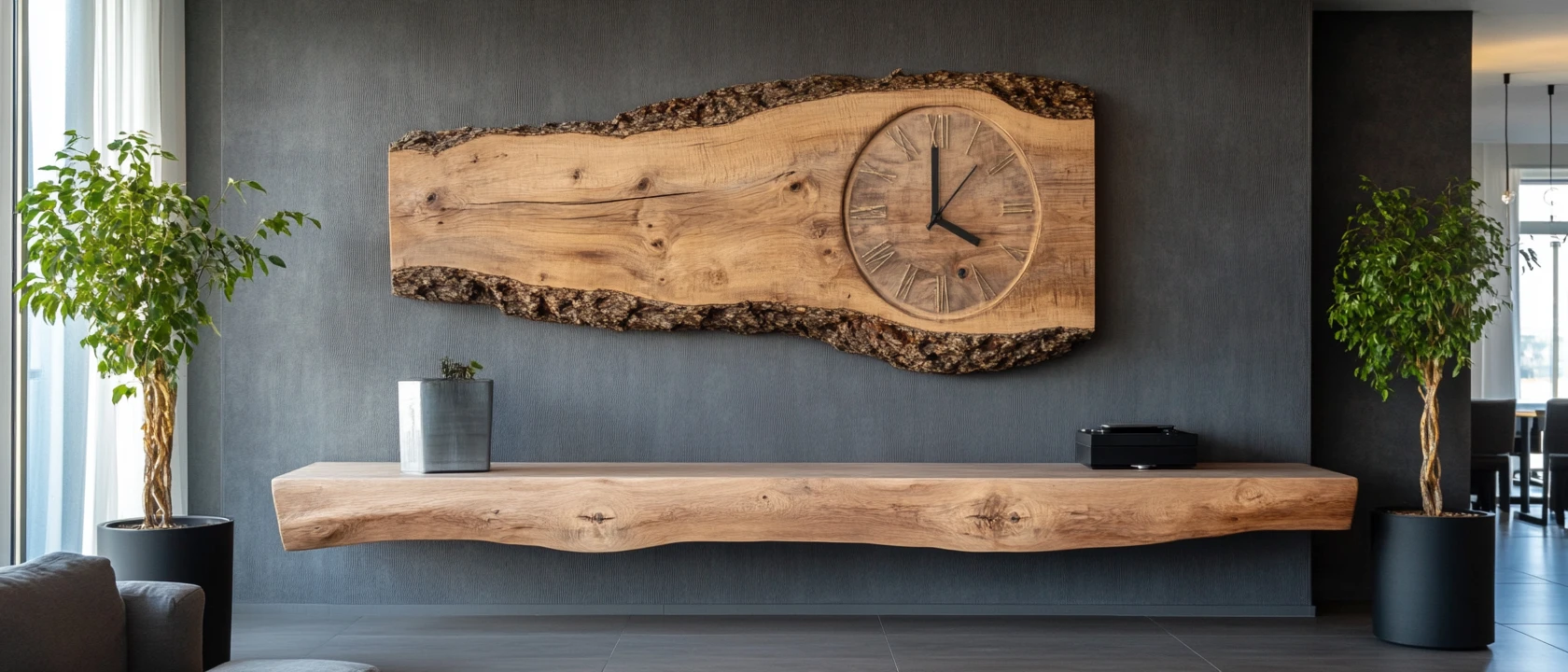 Большой спил дерева или широкая доска могут стать основой для уникальных настенных часов. Приобретите часовой механизм, прикрепите его к центру деревянной основы, добавьте цифры или метки — и оригинальные часы готовы!