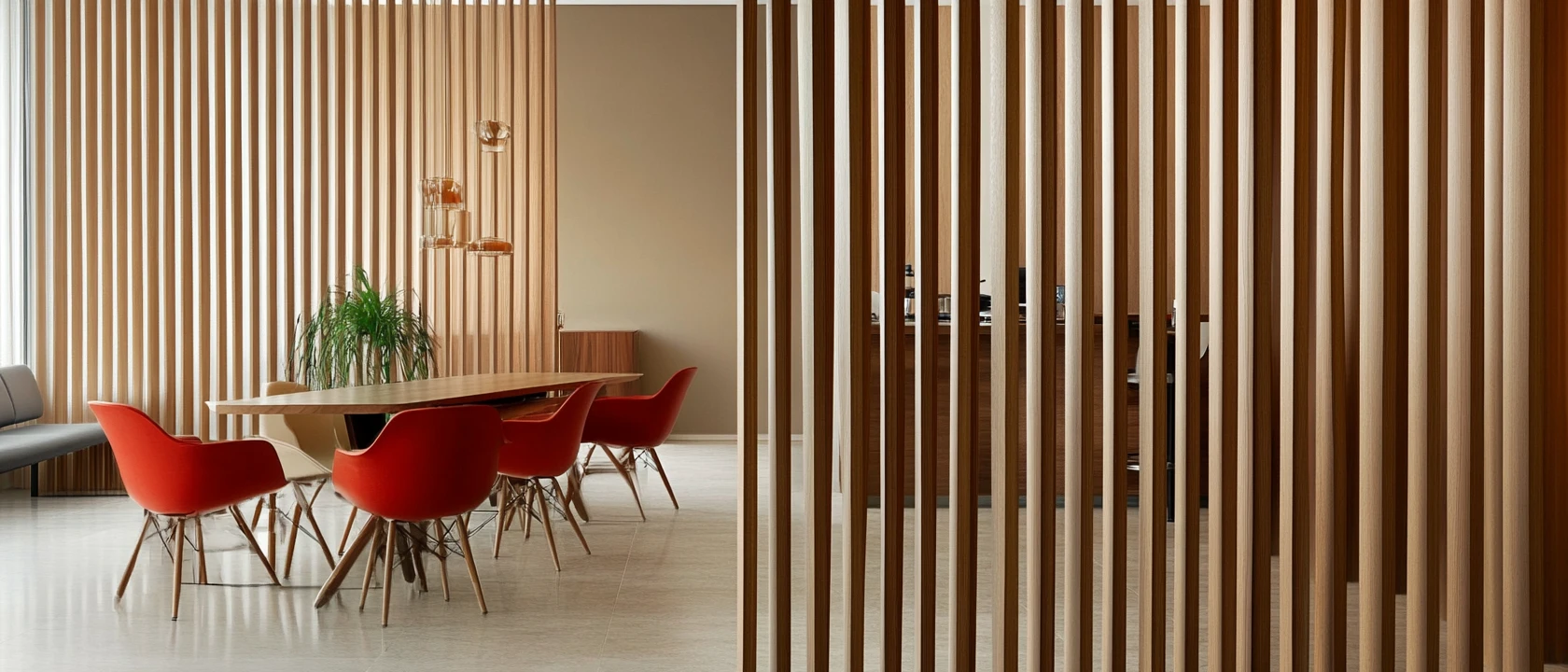 Из длинных тонких реек можно создать декоративную перегородку для зонирования пространства. Закрепите рейки на двух горизонтальных планках на равном расстоянии друг от друга. Такая перегородка станет стильным элементом интерьера и поможет разделить комнату на функциональные зоны.