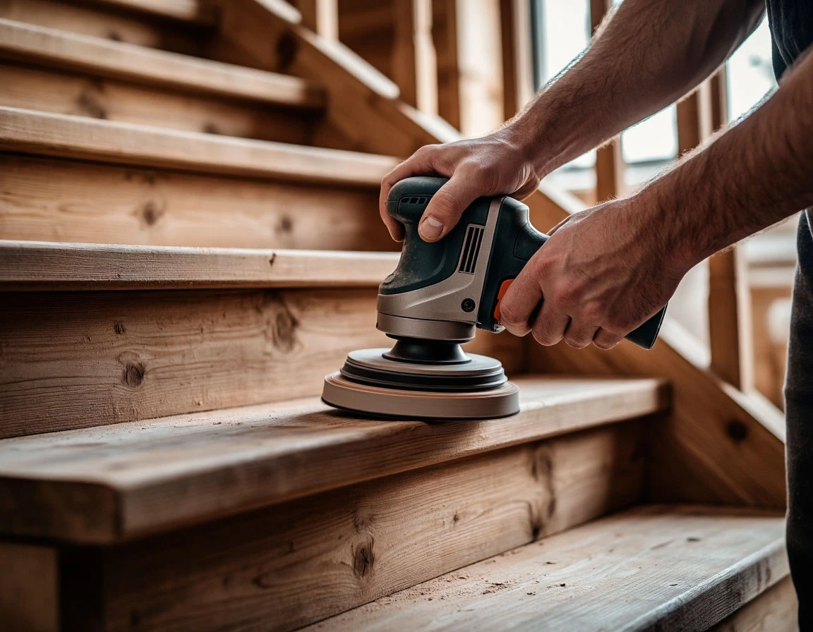 - Финишная шлифовка (зернистость 180–220) — создание идеально гладкой поверхности для нанесения лака или краски. Этот этап особенно важен для лестницы из мягких пород дерева, таких как сосна.