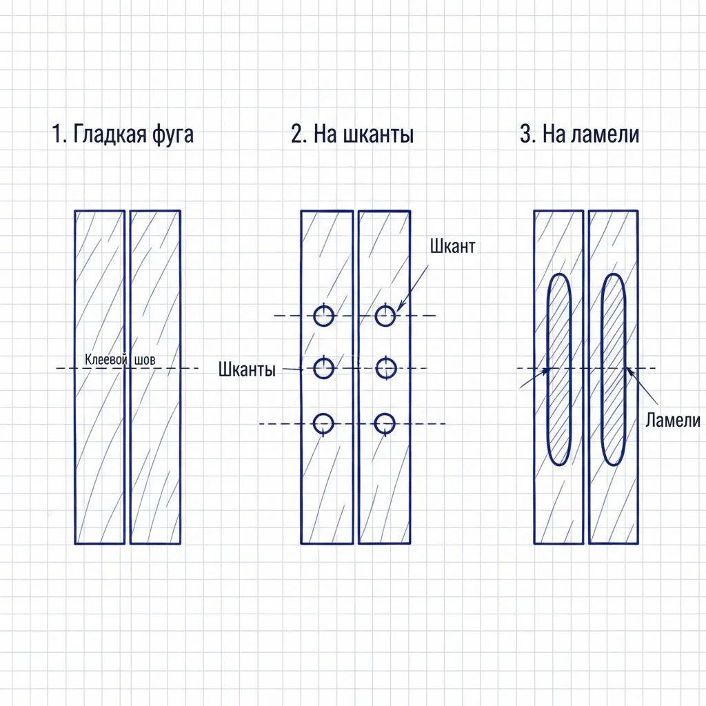 Это классический способ усиления соединения на гладкую фугу. Шканты — это небольшие деревянные цилиндры, которые вставляются в предварительно просверленные отверстия в кромках обеих досок. Они выполняют сразу две важнейшие функции: служат направляющими при сборке и значительно увеличивают прочность соединения.