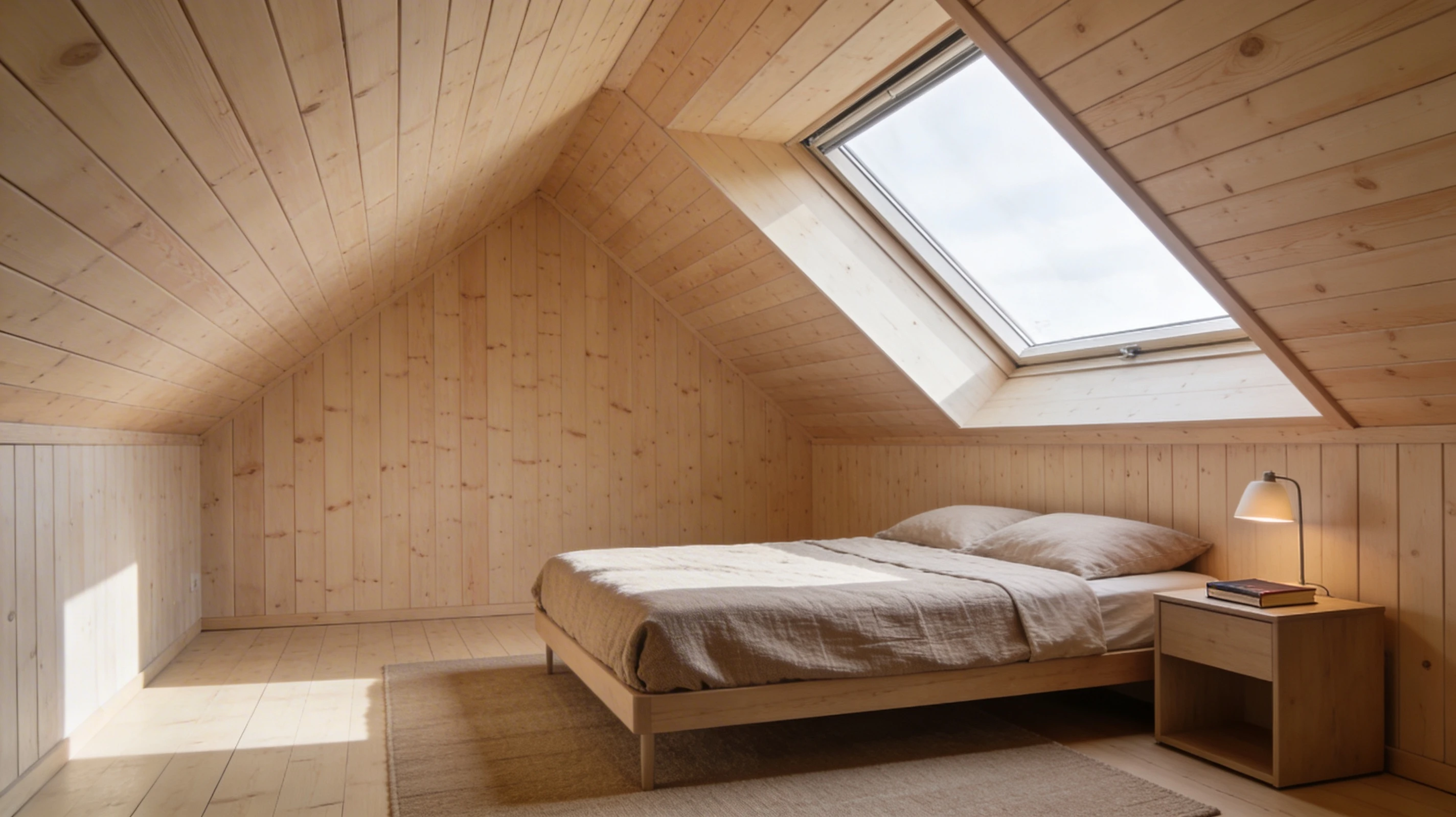 - Сосна. Универсальный вариант для жилых мансард: доступная, достаточно прочная, с характерным рисунком и приятным хвойным запахом. Подходит для спален, детских, кабинетов и гостевых комнат.