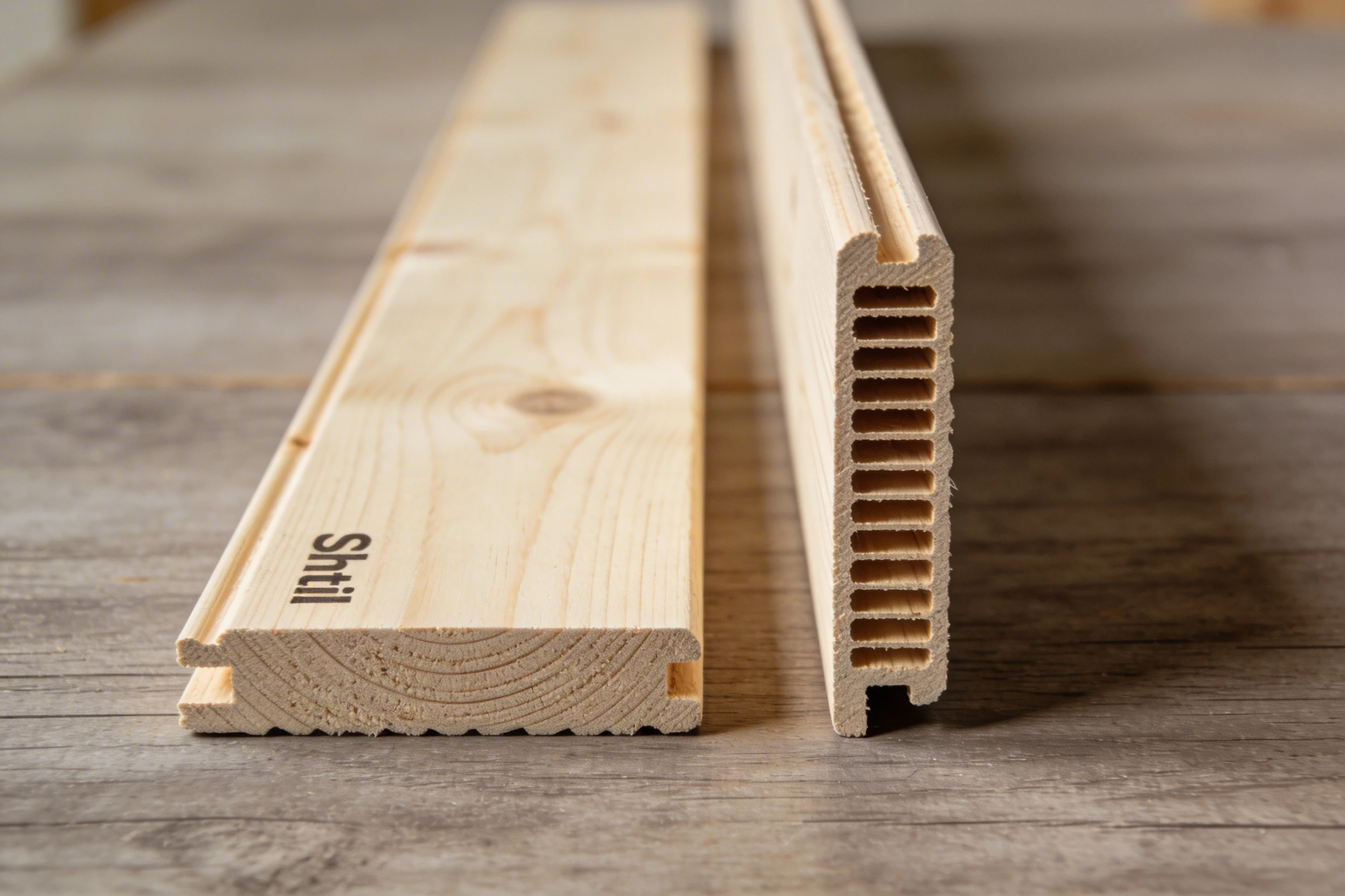 - Профиль «Штиль». Формирует более ровную, «спокойную» поверхность без выраженных фасок и создаёт эффект почти цельной деревянной плоскости. За счёт компенсационных прорезей с тыльной стороны уменьшает деформации при перепадах температуры и влажности.