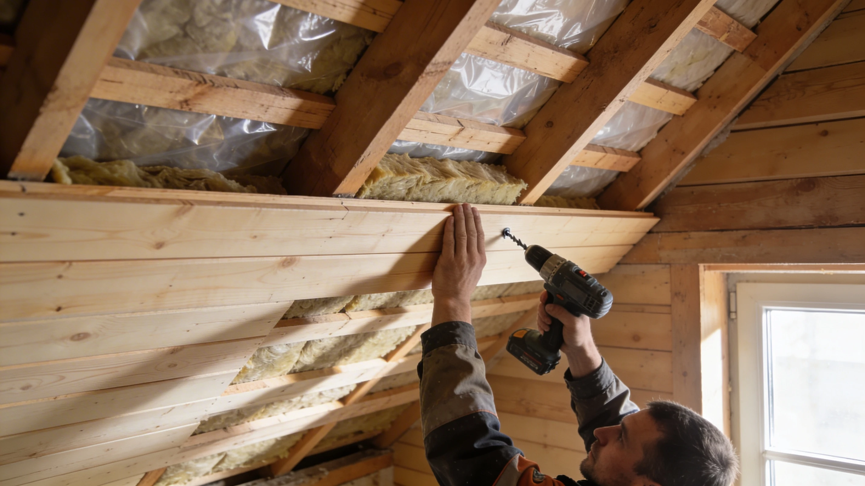 - Утепление и пароизоляция. Сначала укладывают утеплитель (минеральная вата, стекловолокно или плиты из пенополистирола), затем поверх него - пароизоляционную плёнку с герметизацией стыков. Это защищает древесину от конденсата из тёплого воздуха помещения.