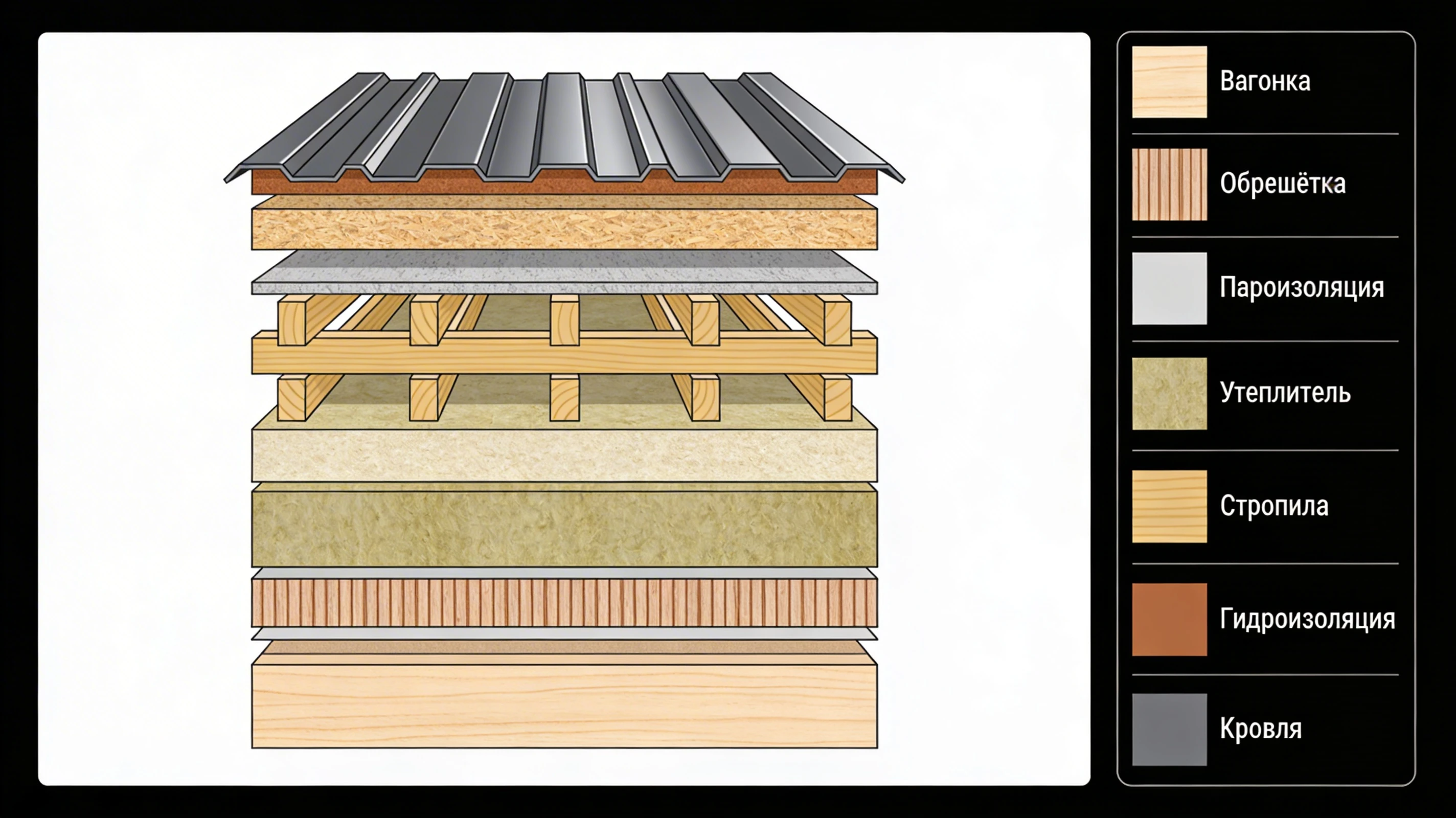 - Гидроизоляция и вентзазор. Со стороны кровли устраивают гидроизоляцию и оставляют вентиляционный зазор между кровлей и утеплителем, а также между утеплителем и обшивкой. За счёт циркуляции воздуха снижается риск появления плесени и гниения.